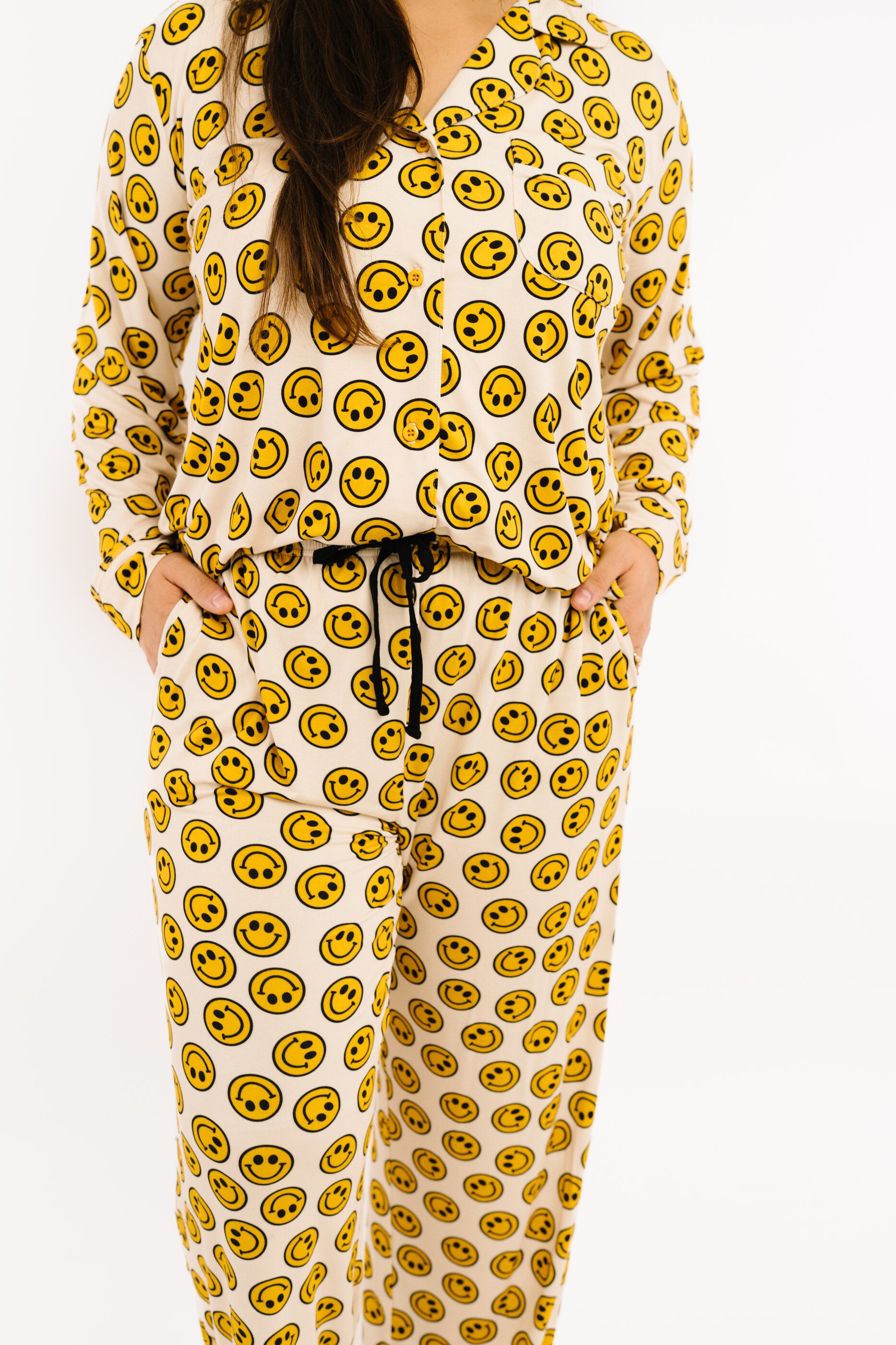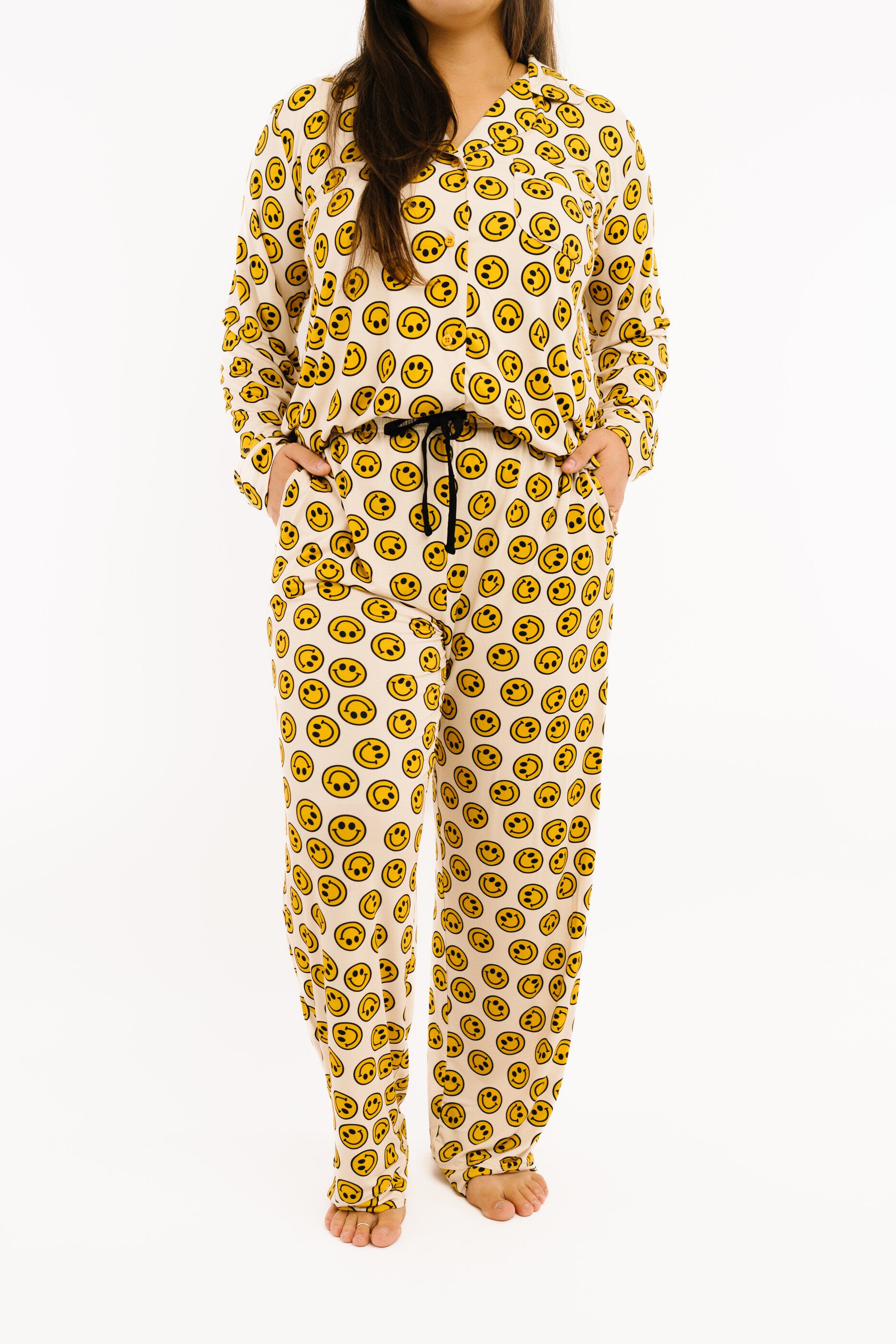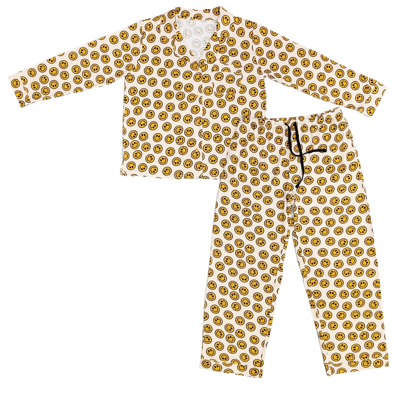 This cozy two piece set includes a long sleeve button up top and matching bottoms, designed for ultimate comfort and style.