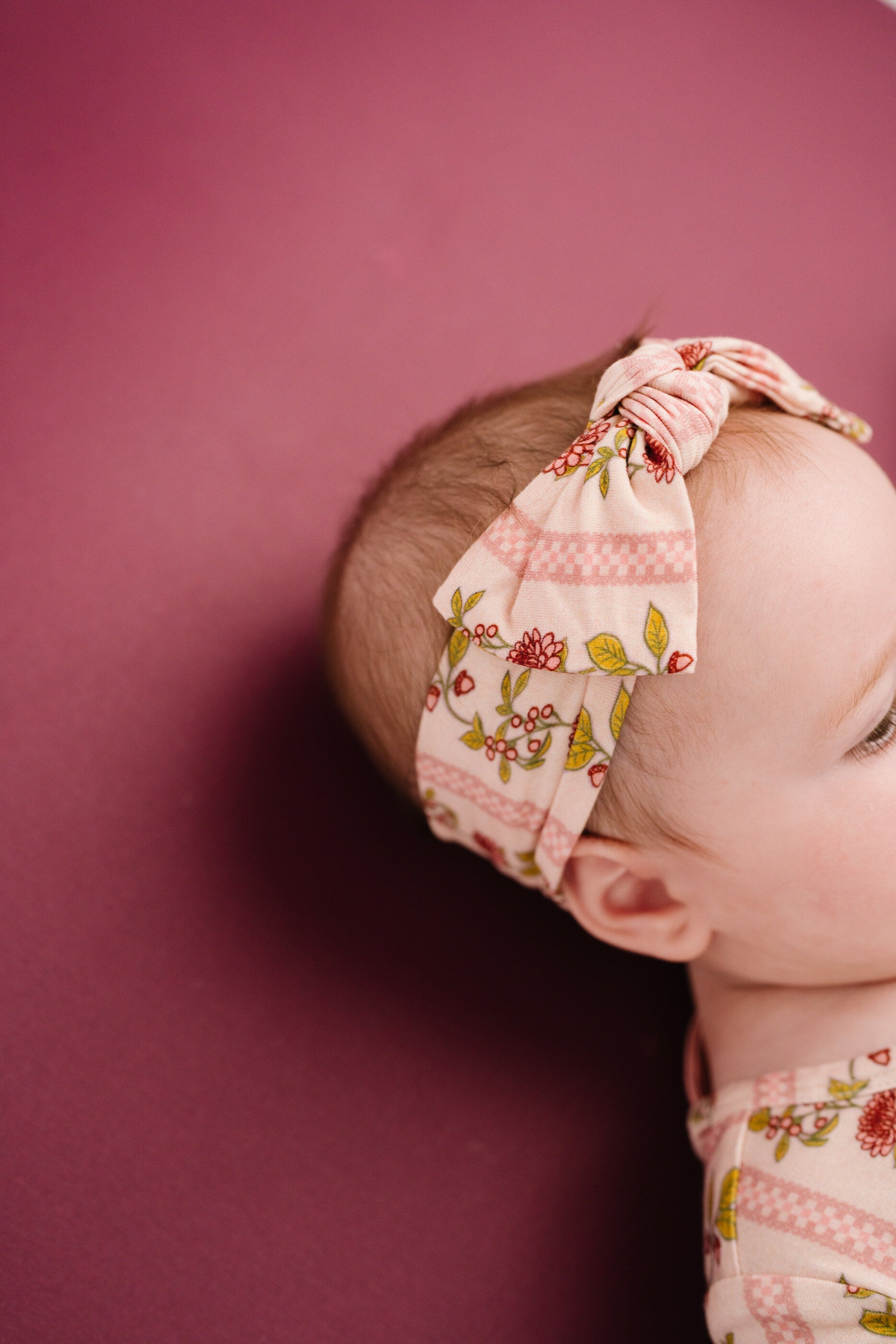 Bamboo Bow Headband (NB–3T): Made from our signature 95% bamboo and 5% spandex blend, this headband is soft and stretchy. The knotted bow adds a sweet touch, and the comfy fit grows with your little one from newborn to toddler (NB–3T).